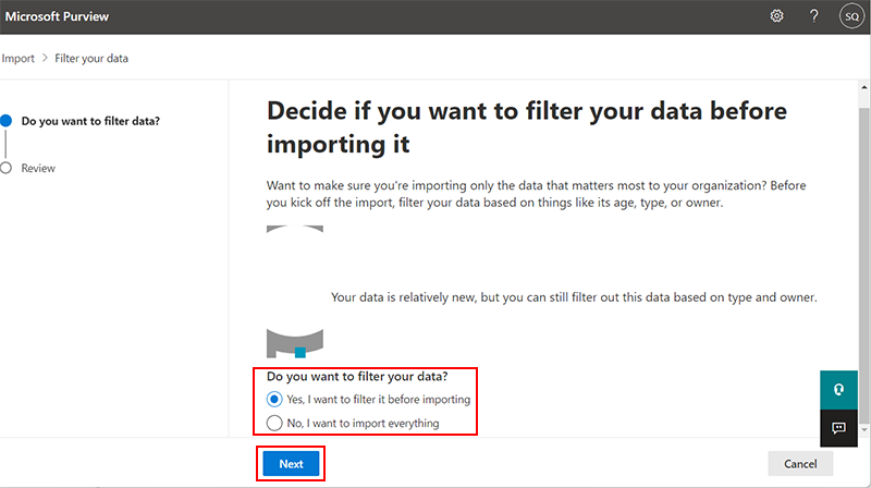 - Käytä suodattimiaPST: n tuominen Office 365: lle jaettuun tai ensisijaiseen postilaatikkoon.