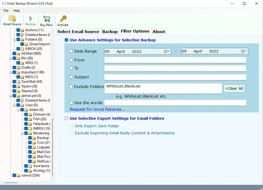- Sen jälkeen napsautaSuodatinvaihtoehtovanhojen sähköpostien palauttaminen tietyn ajanjakson aikana. Täytä kaikki ennakkoasetukset vastaavasti.