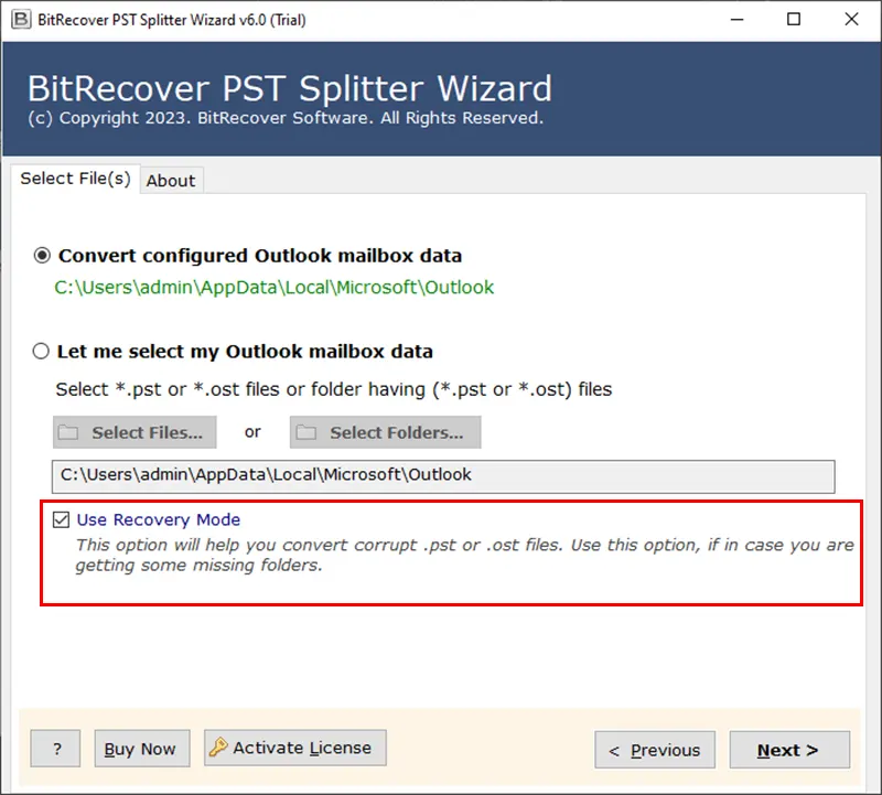 - Jos joudut jakamaan korruptoituneen PST -tiedoston vuodessa, tarkista ”Palautustila”Vaihtoehto.