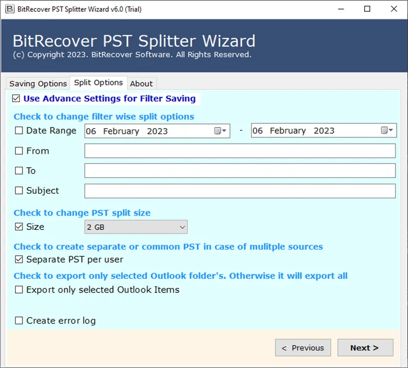 Kukaan ei halua tuhlata aikansa tekemällä niin helppoa työtä, joka voidaan tehdä vain muutamalla napsautuksella. Onneksi on saatavana useita online -työkaluja. Heidän joukossaan,BitRecover PST Split -työkaluOutlook erottuu edistyneeksi ja luotettavaksi vaihtoehtona. Tämän ohjelmiston avulla voit vähentää PST -tiedostojen kokoa helposti ja tarkkuudella jakamalla PST -tiedostot vuodessa ja muut suodatusvaihtoehdot.