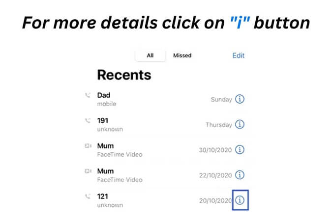 - 3Saat lisätietoja puhelusta napsauttamalla numeron vieressä olevaa sinistä "i" -kuvaketta.