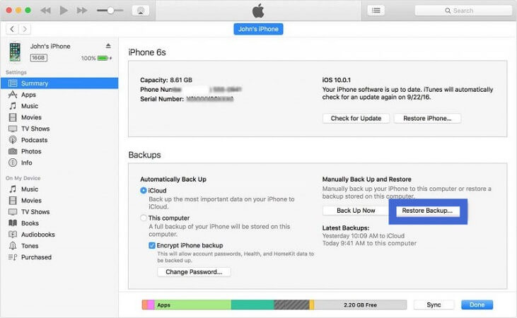 - 2iPhone-kuvake näkyy vasemmassa sivupalkissa. Napsauta sitten Palauta varmuuskopio.