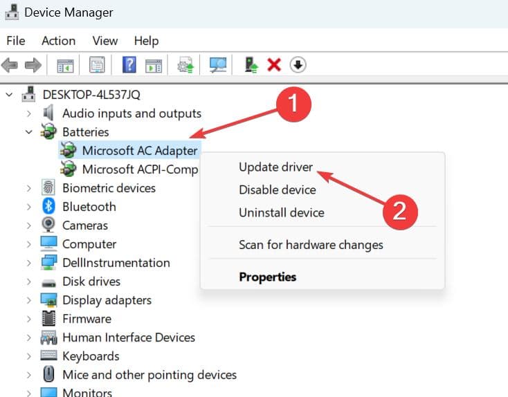 - Etsi ja laajenna akkuja, napsauta hiiren kakkospainikkeella akkua ja valitse Päivitä ohjain.