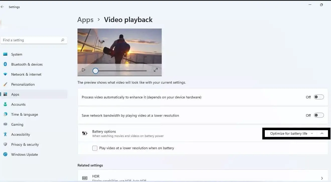 Jos käytät säännöllisesti kannettavaa tietokonetta videoiden suoratoistoon tai elokuvien katseluun, voit muuttaa videotoistoasetuksia parannuksen suorituskyvyn lisäämiseksi.