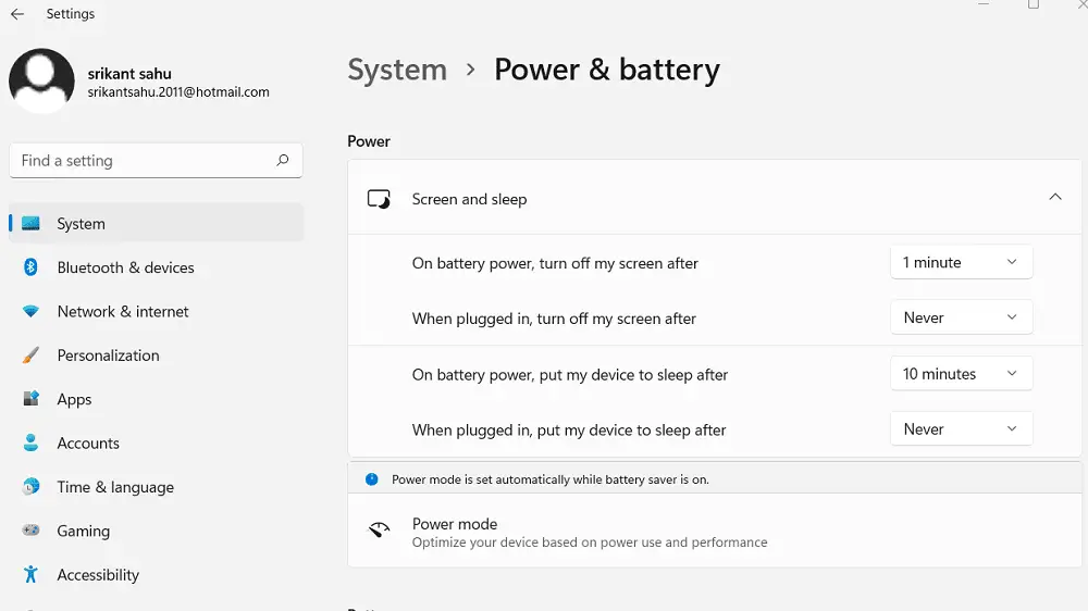 - Siirry järjestelmään ja sitten Power & Battery -vaihtoehto oikeasta ruudusta