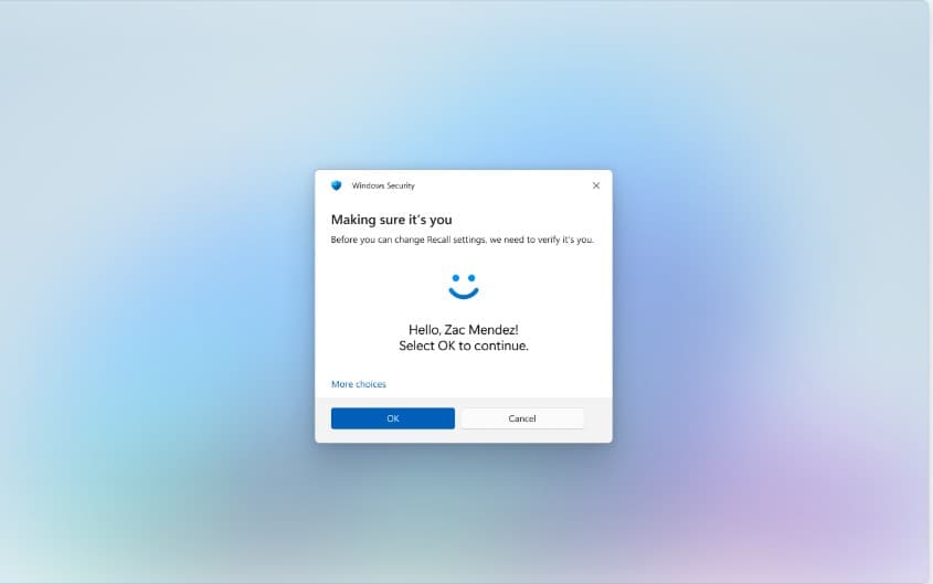Aina kun avaat Recallin tai muutat sen asetuksia, se pyytää sinua vahvistamaan henkilöllisyytesi käyttämälläWindows Hello, joka voi olla kasvosi, sormenjälkesi tai PIN-koodi. Tällä varmistetaan, että vain sinä näet tallentamiasi tilannekuvia tai voit olla vuorovaikutuksessa niiden kanssa. Tietosi on salattu ja suojattu, joten ne pysyvät yksityisinä ja turvallisina.