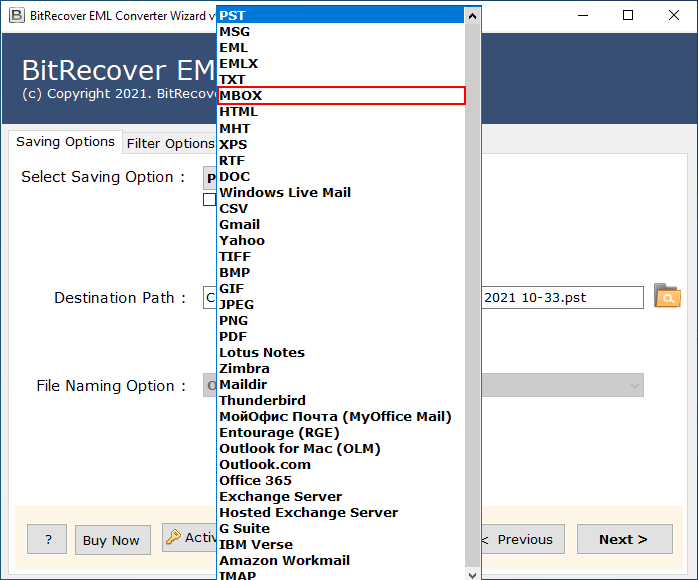 3. Sen jälkeen voitvalitse haluamasi Mac-yhteensopiva tulostusmuoto(kuten MBOX).