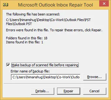 Jos PST-tiedosto on olemassa, mutta sitä ei voi avata, PST-tiedosto vioittuu. Käytä Microsoft Outlook Inbox Repair Tool -työkalua alla selostetulla tavalla: