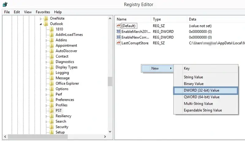 2. Siirry osoitteeseen: hkey_current_user \ Software \ Microsoft \ Office \ 16.0 \ Outlook \ Options \ Mail