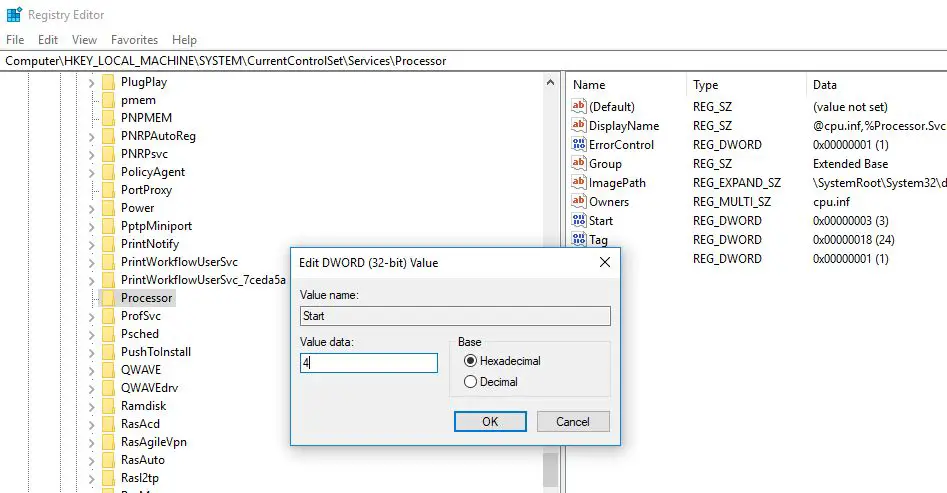 Täällä näet useita DWORD -tiedostoja, kaksoisnapsautaAlkaaVaihda arvo arvoon 4 ja OK.