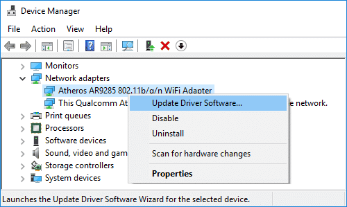 - Täällä laajennetusta luettelosta napsauta hiiren kakkospainikkeella tietokoneesi WiFi-sovitinta ja napsauta sitten Päivitysohjaimen ohjelmisto -vaihtoehtoa asiayhteysvalikossa.