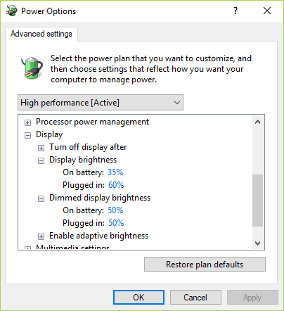 HUOMAUTUS: Jotkut käyttäjät ilmoittavat käännettävistä kirkkausvaihtoehdoista virtavaihtoehdoista, minkä avulla he voivat mukauttaa näytön kirkkautta. Voit myös kokeilla tätä ”käännekohtaa mukautuvaa kirkkautta” ja tarkistaa, että se voi auttaa sinua.