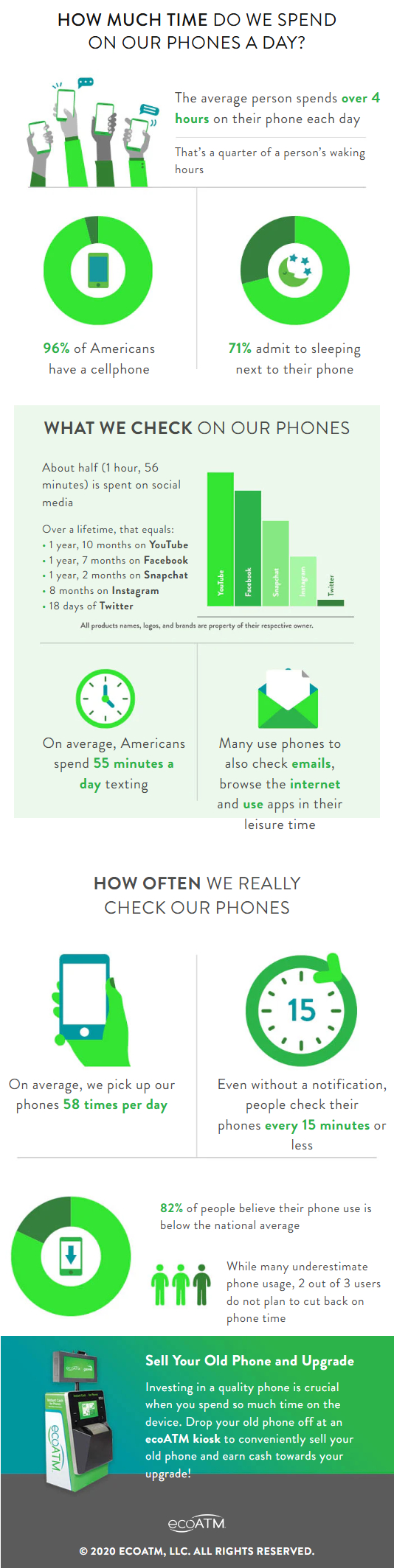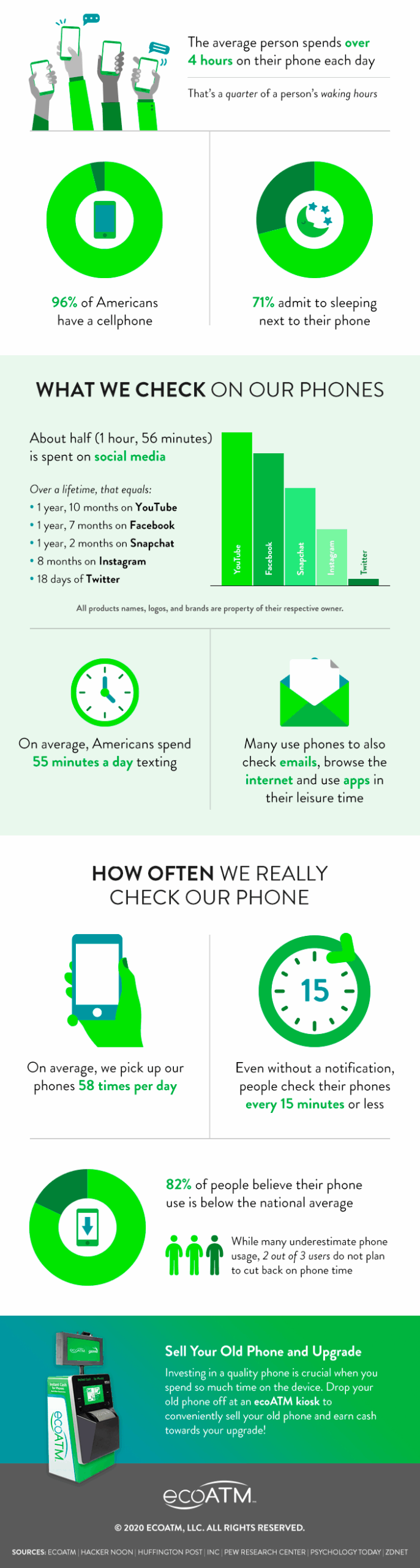 Useimmille ihmisille emme ole koskaan muutaman metrin päässä matkapuhelimestamme. Kuinka paljon aikaa käytät puhelimellasi joka päivä? Ovatko nämä tilastot saaneet sinut päättämään käyttämään älypuhelintasi vähemmän, vai suunnitteletko nykyisen laitteesi päivittämistä, jotta voit käyttää sosiaalisen median suosikkisovelluksiasi nopeammin? Jos suunnitelmasi on jälkimmäinen, älä unohda sitäkatso ecoATMkun olet valmis vaihtamaan vanhan puhelimesi.