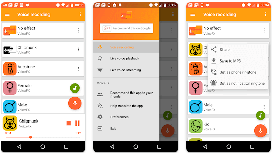 VoiceFXon tunnetuimpiaSotilasradioäänenvaihdinAndroidille saatavilla olevat sovellukset, jotka voit ladata ilmaiseksi. Yksi tämän sovelluksen eduista on sen käyttäjäystävällinen käyttöliittymä ja sujuva toiminta. Se ei ole vain äänenvaihtaja, vaan siinä on myös edistyneitä äänitallennusominaisuuksia. Sovelluksen avulla voit muokata musiikkiasi helpon pääsyn ja jakamisen sosiaalisen median kautta. Voit myös palata äänesi muissa mediasoittimissa ja sosiaalisessa mediassa muutetun äänen avulla.