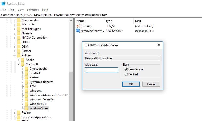 - Tässä kaksoisnapsautaPoista WindowsStoreja muuta sen arvo 1 arvoksi 0