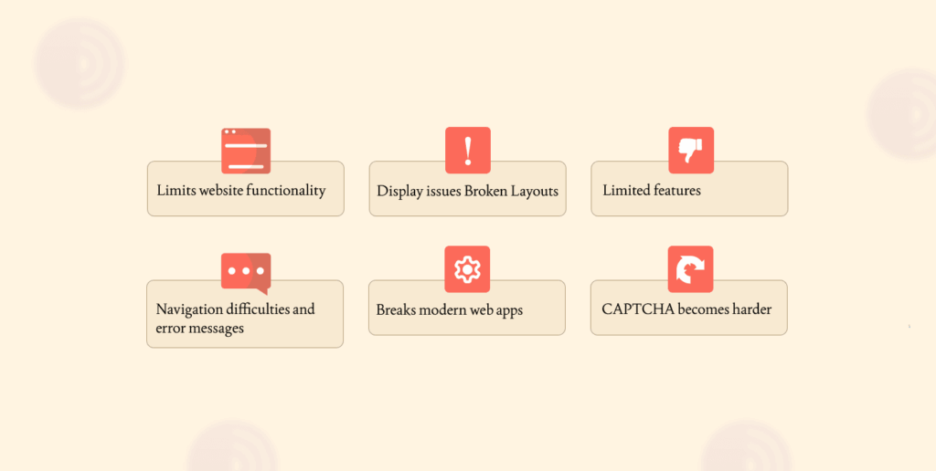 - CAPTCHA muuttuu vaikeammaksi: Monet CAPTCHA-palvelut toimivat JavaScriptin avulla. Sen poistaminen käytöstä voi johtaa useammin esiintyviin ja usein ratkaisemattomiin CAPTCHA-haasteisiin.