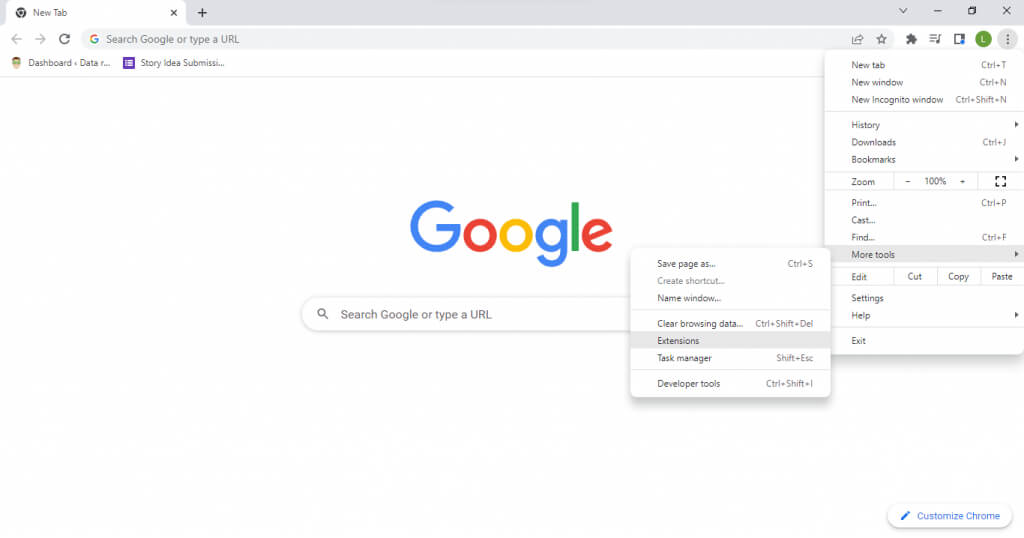 - Voit poistaa laajennukset käytöstä Google Chromessa, avaa kolmipisteen valikko oikeasta yläkulmasta ja valitseLisää työkaluja-Pidennys. Voit myös kirjoittaaChrome: // Laajennuksetja paina ENTER.