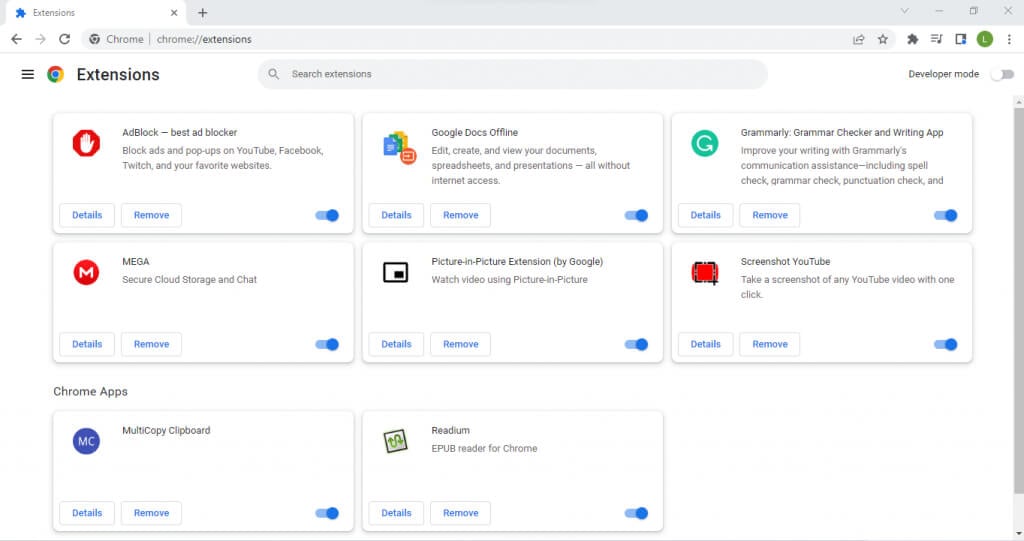 - Tämä näyttää luettelon selaimeen asennetuista laajennuksista. Voit helposti poistaa minkä tahansa niistä sinisellä vaihdolla.
