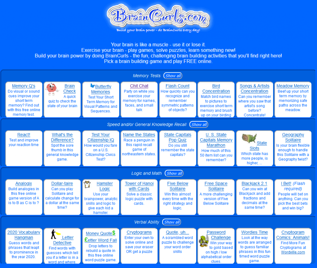 BrainCurls on verkkosivusto, jossa on laaja valikoima erilaisia pelejä, jotka on suunniteltu saamaan aivosi toimimaan. Tällä sivustolla on kaikkea muistipeleistä, sanapeleistä, erilaisista pulmapeleistä ja loogisista kysymyksistä. Sivustolla on jopa chat-peli, joka auttaa sinua harjoittelemaan kasvojentunnistusta ja muistia, jotka voivat auttaa sinua tulevissa sosiaalisissa vuorovaikutuksissa.