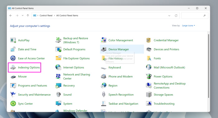 control /name Microsoft.IndexingOptions2.PainaAntaa avainavataIndeksointivaihtoehdotIkkuna ja napsauta sittenEdistynytsiinä.
