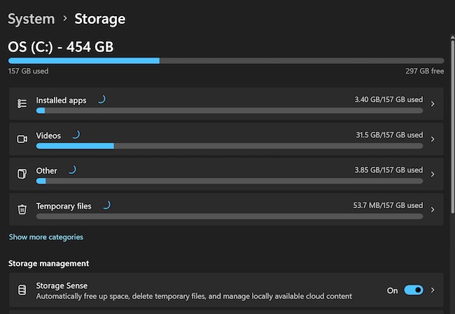 - Käynnistä tietokoneellasiAsetukset-sovellus > Järjestelmä > Tallennustila.