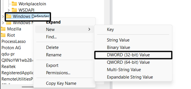 3.PeräisinUusiAlivalikko, valitseDWORD (32-bittinen) arvomahdollisuus luoda uusi merkintä.