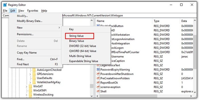 4.Napsauta hiiren kakkospainikkeella tyhjää tilaa oikeassa ruudussa ja valitseUusi> merkkijonoarvovaihtoehto.