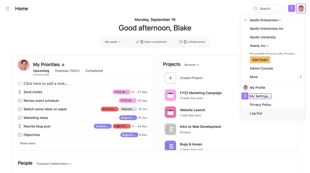 - Yhteistyökalut.Kommentoi tehtäviä, mainitse ryhmän jäseniä ja pidä keskusteluja yksittäisissä tehtävissä. Asana tarjoaa myös virtuaalisia kokoushallintatyökaluja yhteistyön parantamiseksi.