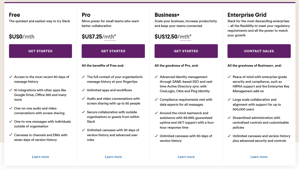 - Ammattilaiset-7,25 dollaria kuukaudessa käyttäjää kohti. Lisää koko viestihistoria, rajoittamattomat sovellukset, videokeskusteluja jopa 50 ihmisen kanssa ja edistyneitä tietoturvaominaisuuksia.