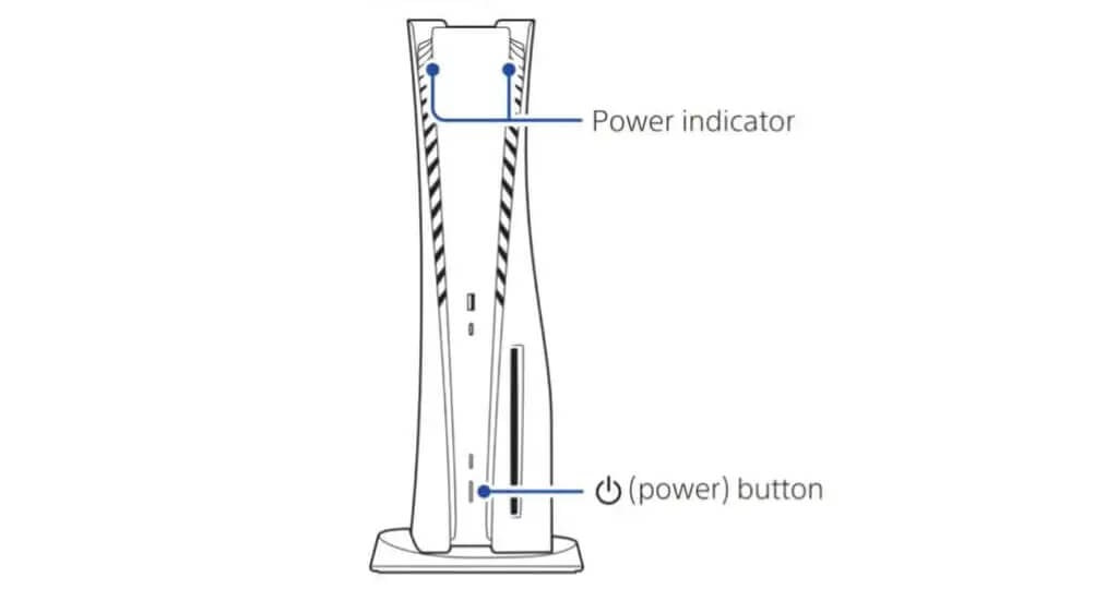 Jos omistat PS5:n levyversion, näet kaksi painiketta etupuolella: Eject ja Power. Virtapainike on pidempi, ja sen vasemmalla tai alapuolella on vakiovirtasymboli. Konsolin digitaalisessa versiossa se on ainoa fyysinen painike kotelossa.