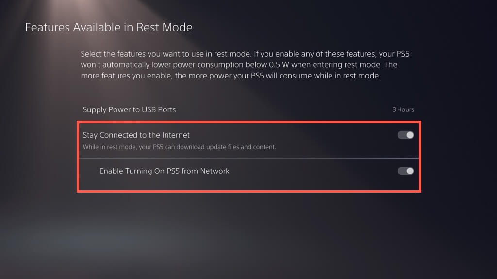 - Siirry osoitteeseenJärjestelmä>Virransäästö>Ominaisuudet saatavilla lepotilassaja aktivoidaPysy yhteydessä InternetiinjaOta käyttöön PS5:n käynnistäminen verkosta.