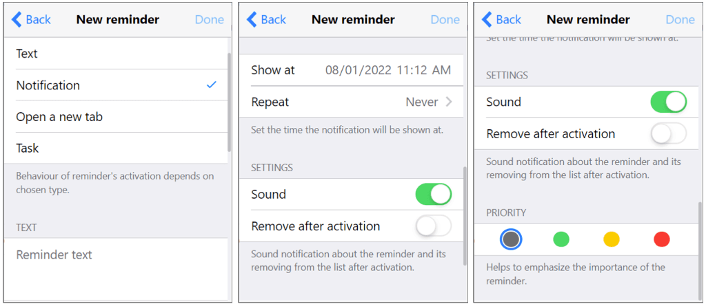 Kaikki vaihtoehdot lukuun ottamatta tekstityyppiä, voit valita päivämäärän, ajan ja valinnaisesti toistaa muistutus. Lisää kuvaus, valitse väri sen prioriteettiin ja valitseTehtyoikeassa yläkulmassa.