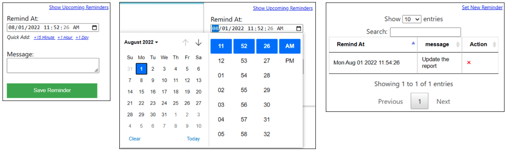 Lisää muistutus, kirjoita nimi ja valitse sitten muistuttaa tietyllä minuutissa tai tarkalla päivämäärällä. Lisäosan ikkuna näyttää myös nykyisen päivämäärän ja ajan, joka on yksi näistä todella hyödyllisistä ominaisuuksista.