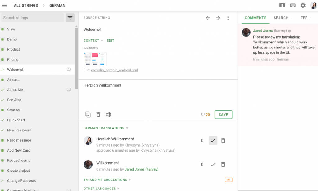 Crowdinin hauskin ominaisuus on, että tiimin jäsenet voivat työskennellä yhdessä käännösprojekteissa ja auttaa toisiaan. He voivat myös kommunikoida alustan kautta varmistaakseen, että tehtävä suoritetaan tarkasti. Crowdin on paras sovellus ammattikääntäjille, jotka työskentelevät verkossa.