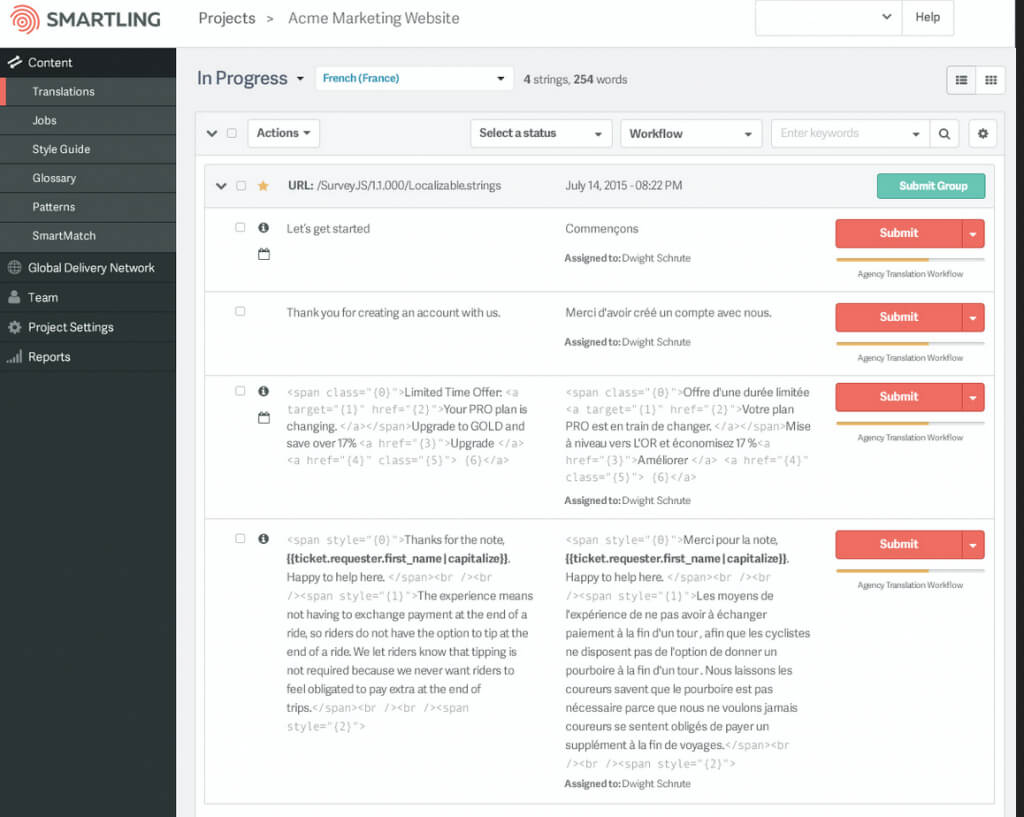 Smartling on tekoälyllä toimiva käännösten hallintajärjestelmä, jonka avulla voit lokalisoida sovelluksia, verkkosivustoja tai erilaisia asiakirjoja. Se voidaan helposti integroida ohjelmiin, kuten Adobe Illustrator, Photoshop tai Figma. Smartlingia ei kuitenkaan ole helppo käyttää. Siinä on jyrkkä oppimiskäyrä, mutta se antaa sinulle vapauden mukauttaa käännösprosessiasi. Siksi se on yksi ammattilaisten parhaista valinnoista.
