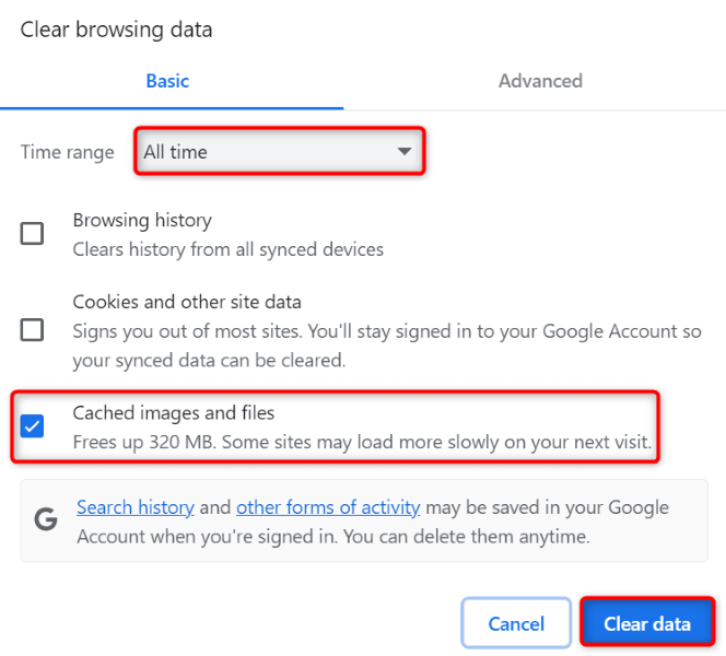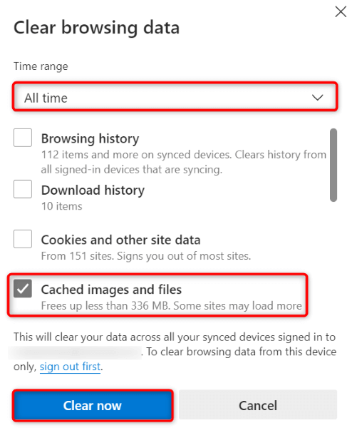 Tässä tapauksessa voit tyhjentää selain välimuistin nopeasti ongelman ratkaisemiseksi. Et menetä tallennettuja salasanoja, kirjanmerkkejä tai selaushistoriaa, kun teet tämän.