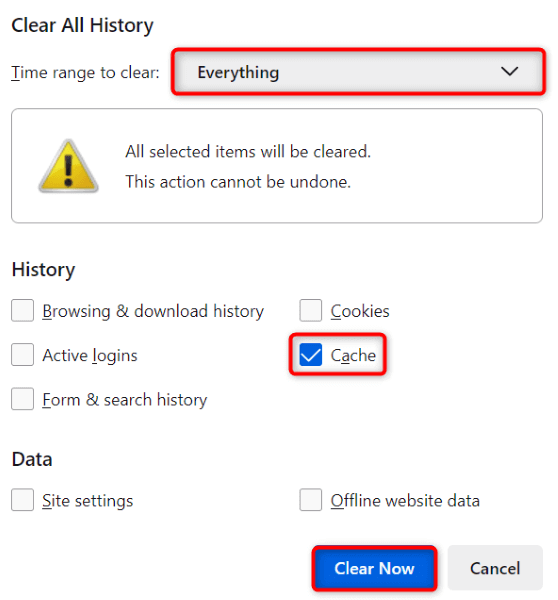 - ValitaKaikkiperäisinAikaväli avattavaan tyhjentämiseenValikko, ota käyttöönVälimuistivaihtoehto ja poista kaikki muut vaihtoehdot käytöstä ja valitseSelkeä nyt.