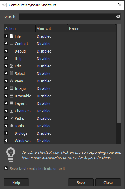 - GIMP näyttää koko luettelon erilaisista komennoista ja pikanäppäimistä, jotka voit ottaa käyttöön. Voit myös luoda mukautettuja pikakuvakkeita tähän ikkunaan.