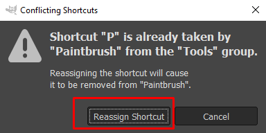 - Jos valitsemasi pikanäppäin on jo määritetty toiselle komennolle, GIMP näyttää ponnahdusikkunan, jossa sinua pyydetään vahvistamaan, että haluat korvata pikanäppäimen.