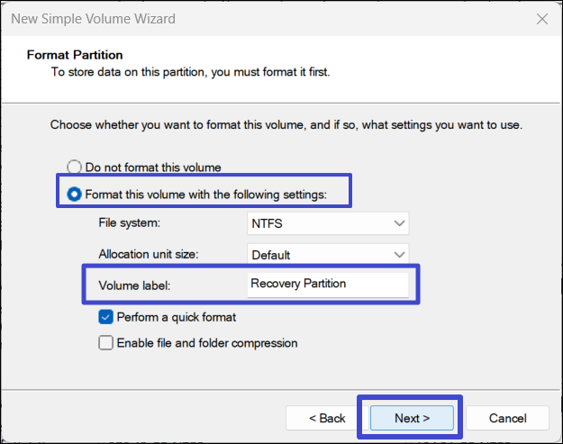 8. Syötä äänenvoimakkuusmerkin nimellä “Palautusjako"Ja napsauta"Seuraava".