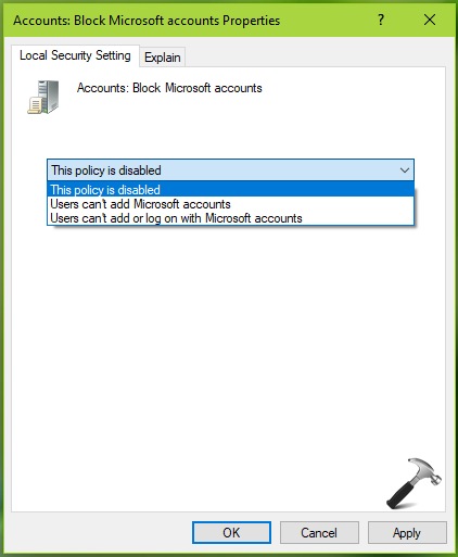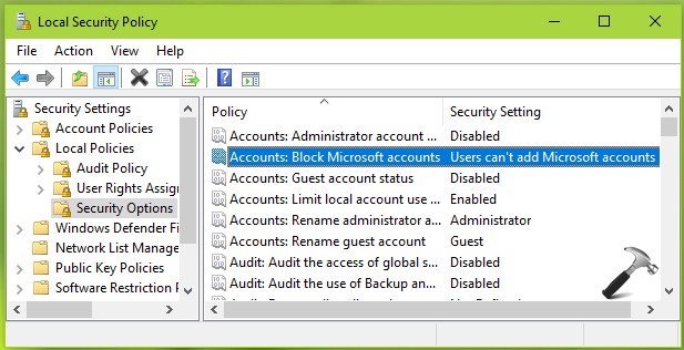 3.Oikeassa ruudussaTurvavaihtoehdot, etsi nimeltään politiikkaympäristöTilit: estä Microsoft -tilit. Kaksoisnapsauta käytäntöä ja aseta seTämä käytäntö on vammainenstatus. NapsauttaaSoveltaamitä seuraaHyvä.