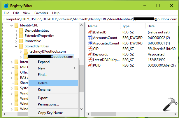 3.Tallennettujen identiteettien rekisteröintiavaimen mukaan etsi rekisteröintiavain tarkkaa lisäämäsi Microsoft-tiliä. Napsauta sitä hiiren kakkospainikkeella ja valitsePoistaa. Vahvistuskehotteessa ilmestyi seuraavaksi, valitseKyllä.