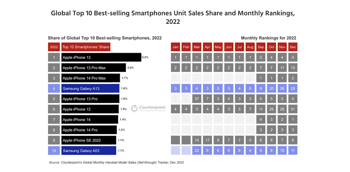 Counterpoint Researchin viimeisin globaali kuukausittainen matkapuhelinmallin myyntiseuranta paljastaa, että Applesta tuli ensimmäinen tuotemerkki, joka varmisti kahdeksan pistettä Global Top 10 -älypuhelinluettelossa vuonna 2022. Samsung vangitsi luettelon jäljellä olevat kaksi pistettä. Yhdessä kymmenen parhaan älypuhelimen osaltaan 19% maailmanlaajuisesta älypuhelinten myynnistä vuonna 2022.