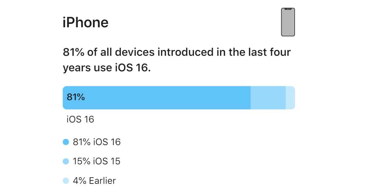 Applen jakamat adoptiotilastotpaljastaaettä vaikka 15% kaikista iPhoneista käyttää edelleen iOS 15: tä, 81% viimeisen neljän vuoden aikana tuotetuista on versio iOS 16: sta. 4% iPhoneista on edelleen julkistamattomia aiempia iOS -versioita.