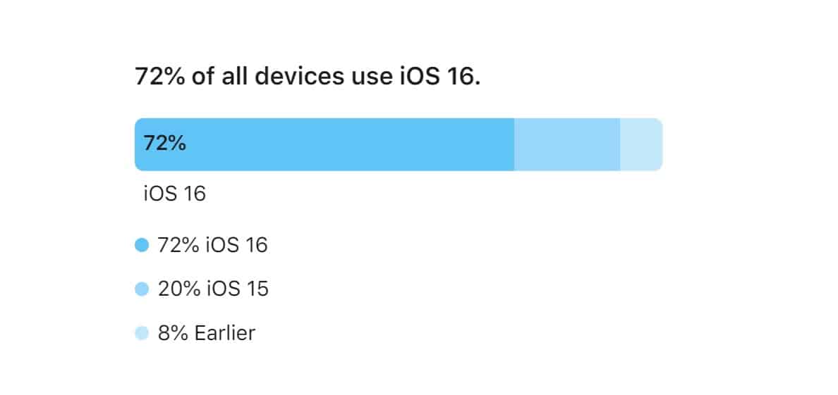 20% iPhoneista on edelleen iOS 15: ssä, kun taas 72% kaikista iPhoneista on iOS 16: lla. Aikaisempi iOS -versio on läsnä noin 8%: lla kaikista iPhoneista.