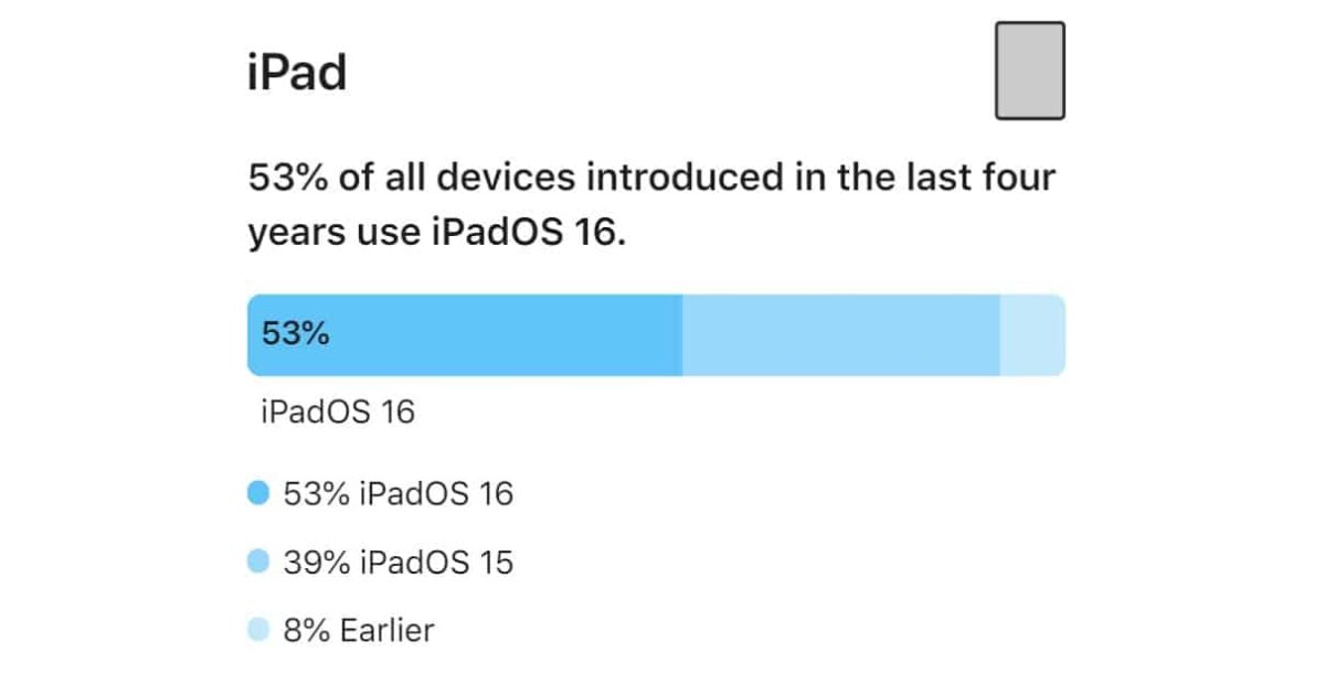 Ipados 16: n osalta 53% kaikista viimeisen neljän vuoden aikana julkaistuista iPadeista on iPados 16, 39% on iPados 15 ja 8%: lla vanhempaa ohjelmistoversiota.