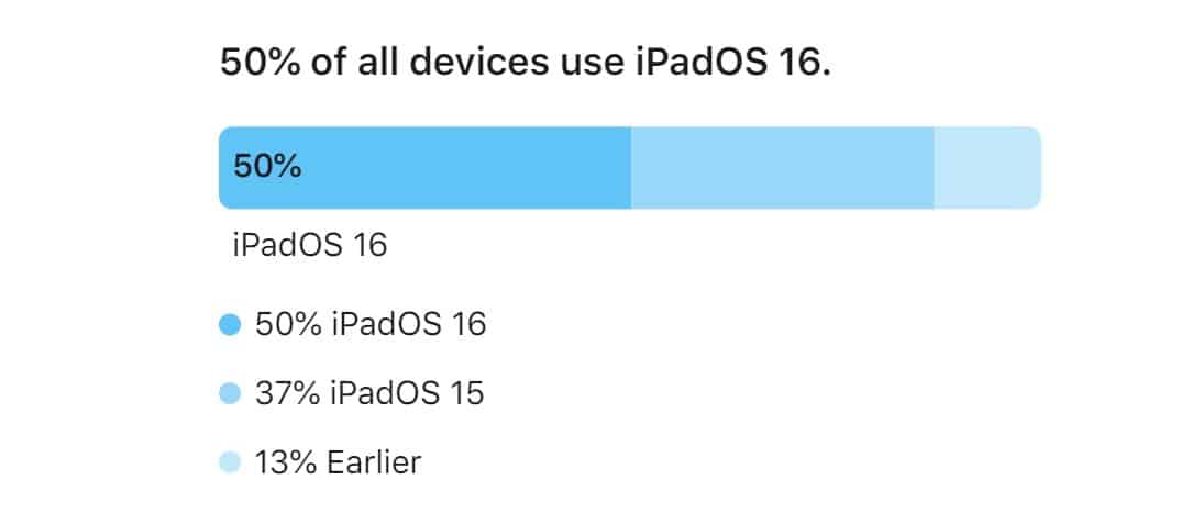 Kaikkien iPadien prosenttiosuudet ovat vertailukelpoisia. 50%: lla on iPados 16 ja 37% iPados 15 ja 13% käyttämällä aikaisempaa versiota.