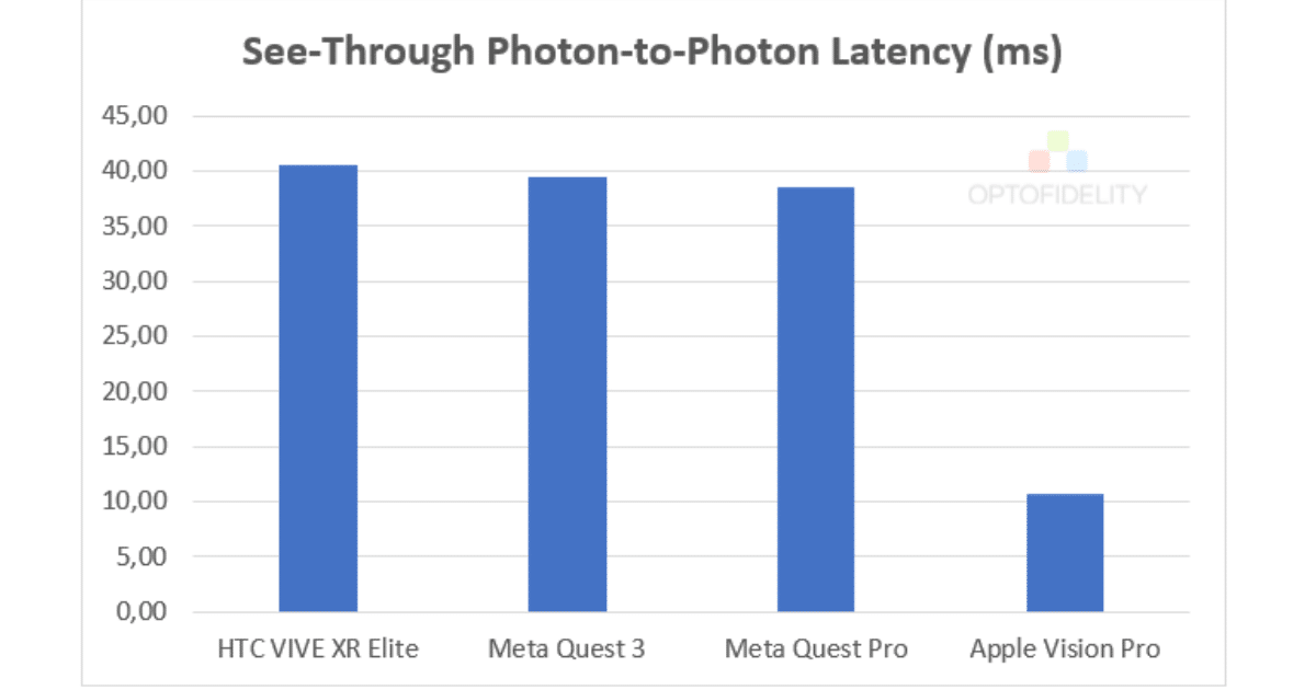 Suoritettu optofidelitykattavat vertailutestitKäyttämällä kaverin testijärjestelmää, joka on varustettu erikoistuneilla laitteilla fotoni-foton-latenssin mittaamiseksi tarkasti. Testit koskivat neljä suurta MR -kuulokkeet: Apple Vision Pro, HTC Vive XR Elite, Meta Quest 3 ja Meta Quest Pro. Huolellisen analyysin avulla Optofidelity tarjosi näkemyksiä näiden laitteiden suorituskyvystä, keskittyen erityisesti latenssimittareihin.