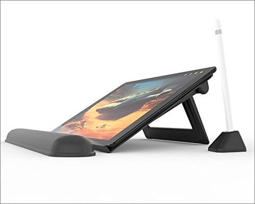 Kuten nimestä voi päätellä, tämä iPad Pro Stand nostaa laitteen antamaan sinulle suoran kulman, kun käytät iPadia. Jalusta sopii täydellisesti suunnittelijoille ja luoville ihmisille, jotka haluavat piirtää jotain nopeasti Apple -lyijykynällä. Tämän jalustan mukana tulee lyijykynäteline ja käsinoja, jotta voit jatkaa työtäsi pitkiä tunteja.