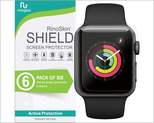 Tässä on toinen haastaja Apple Watch -näytönsuojaimien luettelollemme. Rinogear-näytönsuoja on rakennettu monikerroksisesta älykäs materiaalista, joka on kiinnitetty laitteeseen taitavalla polymeeriliimalla. Seurauksena on, että karkaistu on erittäin mukautuva ja voi helposti sopia Apple Watchin ääriviivat.